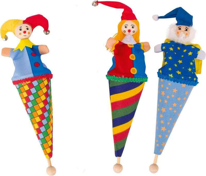Pop-op dukker, i alt 8 forskellige, til titte-bøh og andre klassiske lege med mindre børn. Hovederne er i træ med fine detaljer. De sjove pop-up figurer er gode til historie-læsning, sanglege og meget mere. Dukkerne gemmer sig i kræmmerhuset og springer frem når man skubber pinden op.